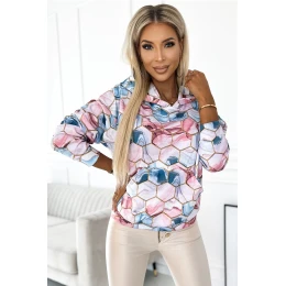 Pohodlná klokaní mikina s kapucí ve zlatých šestiúhelnících s růžovým a modrým mramorovaným vzorem, vyrobená z hřejivé a mírně elastické tkaniny, vyrobená v Polsku, značka numoco.