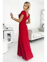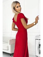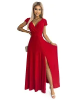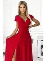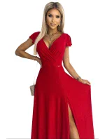 411-2 CRYSTAL lesklé dlouhé šaty s výstřihem - ČERVENÉ