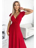 CRYSTAL - dlouhé třpytivé maxi šaty s obálkovým výstřihem a rozparkem na nohavici. Barva: červená se třpytkami. Šaty krásně odhalují dekolt a skvěle se hodí k tanci. Zapínají se vzadu na krytý zip. polský výrobek. značka numoco.