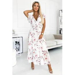 434-4 LISA Plisované midi šaty s výstřihem a volánky - broskvový květ na bílém pozadí