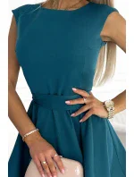 Rozhalené šaty s krátkými rukávy a páskem. z hladkého materiálu v módní mořské barvě. zapínání vzadu na zip. značka numoco. polský výrobek.