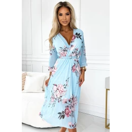 448-3 YUNA Plisované midi šaty s výstřihem a páskem - ROSES na modrém pozadí
