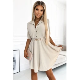 Košilové šaty s límečkem, knoflíky a zlatým páskem. Sukně je na bocích zkrácená, aby opticky prodloužila nohy. Vyrobeno z béžové krepové látky. Ideální šaty pro každou příležitost. značka numoco. evropská výroba.