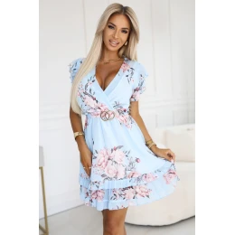 468-3 PATRIZIA šaty s obálkovým výstřihem, páskem a krátkými rukávy - MODRÁ S RŮŽÍ