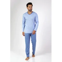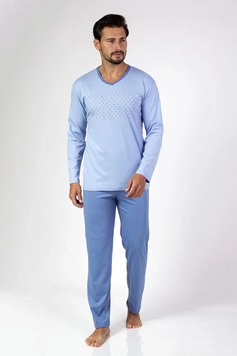 Klasické pánské pyžamo s dlouhými rukávy z kvalitní bavlny. Jednobarevné tričko s výstřihem do V a potiskem na hrudi. Jednobarevné kalhoty s dlouhými nohavicemi.