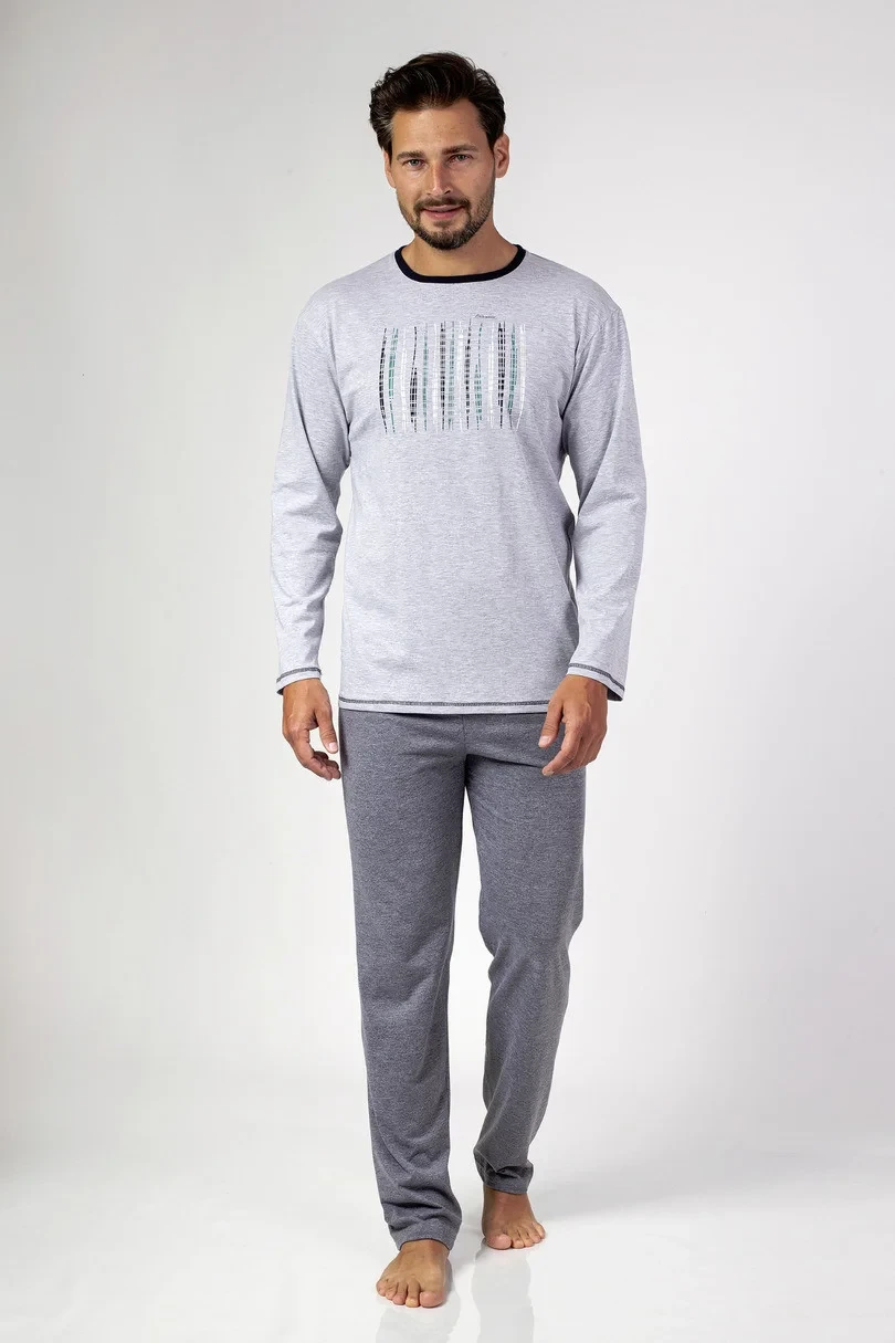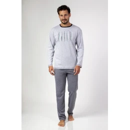 Klasické pánské pyžamo s dlouhými rukávy z kvalitní bavlny. Hladké tričko s kulatým výstřihem a potiskem na hrudi. Doplněno pevnými kalhotami s dlouhými nohavicemi.