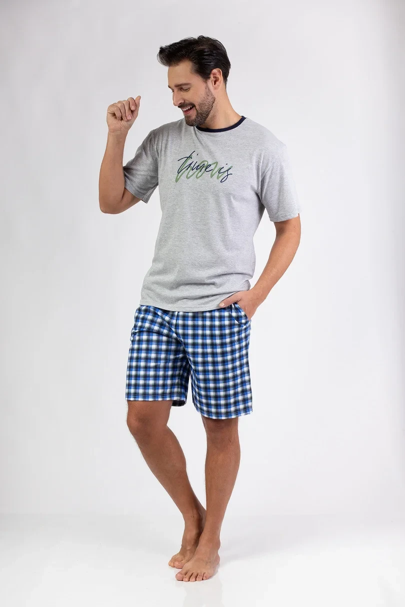 Pánské pyžamo s krátkými rukávy, kulatým výstřihem, vpředu zdobené jemným potiskem, krátké kostkované šortky s kapsami.