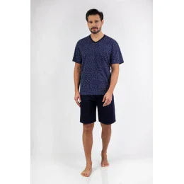 Klasické pánské pyžamo s krátkým rukávem z kvalitní bavlny, se vzorovaným tričkem s výstřihem a jednobarevnými kalhotami s krátkými nohavicemi.
