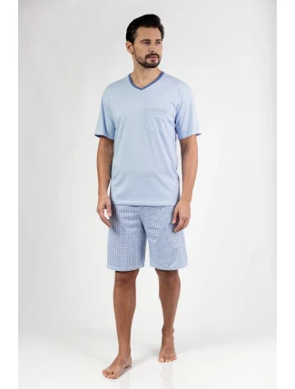Klasické pánské pyžamo s krátkým rukávem z kvalitní bavlny. Jednobarevné tričko s výstřihem a náprsní kapsou. Vzorované kalhoty s krátkými nohavicemi.