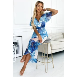 Cinzia - pohodlné šaty s obálkovým výstřihem, dlouhým zavazováním v pase a krátkými rukávy. z elastické síťoviny s podšívkou. vzor: modré velké květy. značka numoco. evropská produkce.