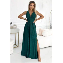 SUSAN - dlouhé šaty s výstřihem, rozparkem na nohou a třemi stehy v pase. Vyrobené z pružné látky s brokátem v zelené barvě. Ideální na svatby, křtiny a jiné významné události. polský výrobek. značka numoco.