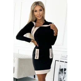 Dvoubarevné šaty se třemi zipy. Ideální do práce, na narozeniny, na nákupy a jiné méně formální příležitosti. Ze silnějšího, pružného materiálu v černé barvě s béžovými vsadkami. Polská výroba. Značka Numoco.