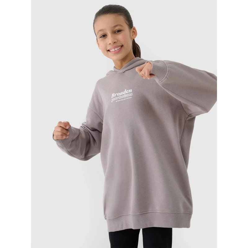 tato dívčí mikina byla navržena pro pohodlí a každodenní aktivity. Oversized střih volně sedí na těle pro naprostou volnost pohybu, zatímco měkký jednolícní úplet poskytuje pružnost a pohodlí. Díky gramáži 240 g/m² je mikina prodyšná, ale stále příjemně měkká, zatímco jednostranně počesaná vnitřní strana zajišťuje extra teplo pro chladnější dny. Je vyrobena ze 70 % bavlny a 30 % polyesteru, takže kombinuje odolnost, měkkost a pohodlnost při nošení. Integrovaná kapuce, elastické manžety a žebrovaný spodní lem přispívají k pohodlí, zatímco potisk"Rozšiřte své obzory" dodává dívčí nádech. Ideální do školy, na trénink i pro každodenní stylizaci.