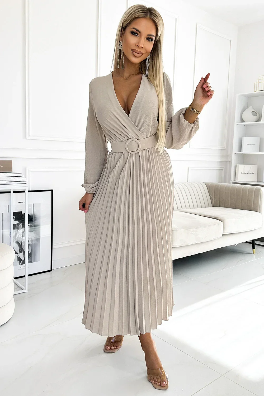 Plisované midi šaty VIVIANA s obálkovým výstřihem, dlouhými rukávy a širokým páskem. vyrobeny z krepové béžové látky. ideální šaty pro každou příležitost. značka numoco basic. evropská výroba