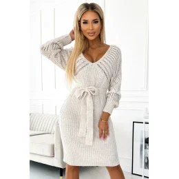 507-1 Ažurové svetrové šaty s výstřihem a vázáním - BEACH