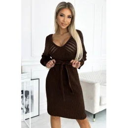 507-3 Ažurové svetrové šaty s výstřihem a vázáním - CHOCOLATE