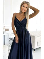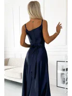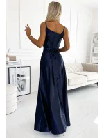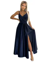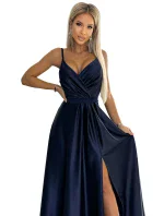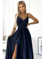 Juliet - elegantní maxi dlouhé saténové šaty s rozparkem na nohou. Krásně tvarovaný výstřih a rozparek na sukni vytváří neobvyklou kompozici. Vyrobeno z lesklého, hladkého, mírně elastického saténu v tmavě modré barvě. Šaty se skvěle hodí na svatby, Silvestra, plesy, karnevaly a další významné příležitosti. Vyrobeno v Polsku společností Numoco.