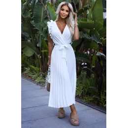 543-1 Plisované midi šaty s výstřihem a jemnými volánky - BÍLÁ