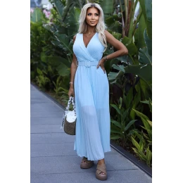 546-2 Plisované šaty se širokým páskem a výstřihem - MODRÁ