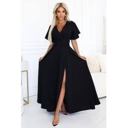 Černé dlouhé šaty s obálkovým výstřihem, rozparkem na nohou a krátkými rukávy. Elegantní, lehké a okouzlující - ideální na svatby, plesy a zvláštní příležitosti. Polský výrobek: značka Numoco.