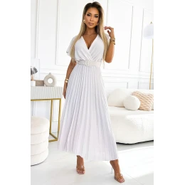 585-1 Plisované letní midi šaty s výstřihem a širokým páskem - ECRU