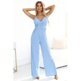 593-2 Elegantní overal s obálkovým výstřihem, širokými nohavicemi a páskem - MODRÝ