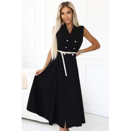 596-3 Elegantní midi košilka se zlatými knoflíky a páskem - ČERNÁ