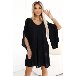 Trapézové černé šaty se třpytkami a motýlími rukávy. Elegantní, pohodlný, lesklý materiál. Ideální pro večerní a zvláštní příležitosti. polský výrobek Numoco.