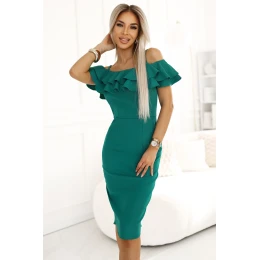 Elegantní španělské šaty s volánky na ramenou. zelená barva. midi střih a mega ženské. značka Numoco. polský výrobek. ideální na svatby, rande a oslavy.
