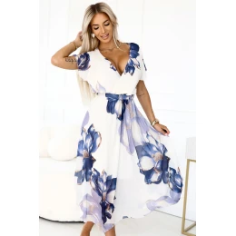 601-1 Vzdušné midi šaty s obálkovým výstřihem a velkým květinovým vzorem - modré odstíny