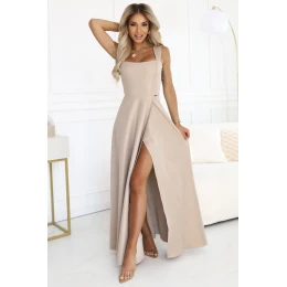 633-1 AURELIA dlouhé šaty s rozparkem a výstřihem typu caro - béžové s brokátem