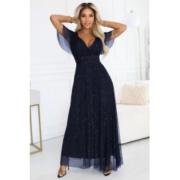 Tyto úžasné dlouhé večerní šaty Numoco Basic jsou určeny ženám, které rády vypadají elegantně a moderně. Tmavě modrá látka pokrytá drobnými lesklými tečkami připomíná hvězdnou oblohu, zatímco obálkový výstřih krásně zvýrazňuje poprsí a zeštíhluje krk. Splývavé, jemně průhledné rukávy dodávají lehkost a vypasovaný horní díl v pase plynule přechází do volného spodního dílu šatů, čímž vytváří velmi ženskou siluetu.