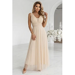 637-4 Dlouhé maxi šaty s brokátovými třpytkami a hlubokým výstřihem - šampaňsko-béžové