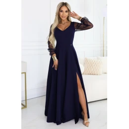 Elegantní tmavě modré dlouhé maxi šaty s tylovými rukávy - smyslná klasika od společnosti Numoco