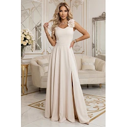 Béžové maxi šaty Numoco s květinou na rameni - elegance pro svatby a zvláštní příležitosti