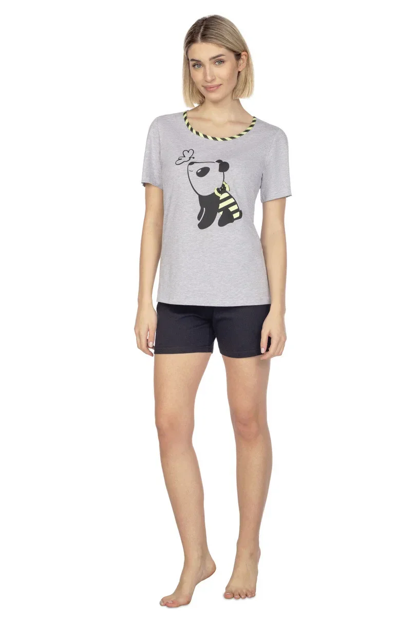 Dámské pyžamo s krátkými rukávy, vyrobené z jemné bavlny, s ozdobným potiskem na prsou, kulatým výstřihem s kontrastním lemováním a krátkými jednotnými šortkami.