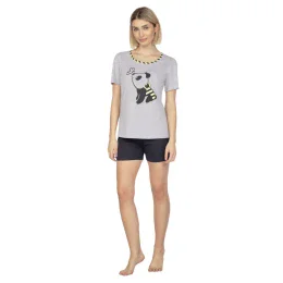 Dámské pyžamo s krátkými rukávy ušité z jemné bavlny. Ozdobný potisk na úrovni hrudníku. Kulatý výstřih lemovaný kontrastní lamówkou. Krátké jednotné šortky.