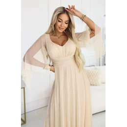 655-4 Dlouhé lehké třpytivé šaty s výstřihem a průhlednými rukávy - šampaňsko-béžová barva