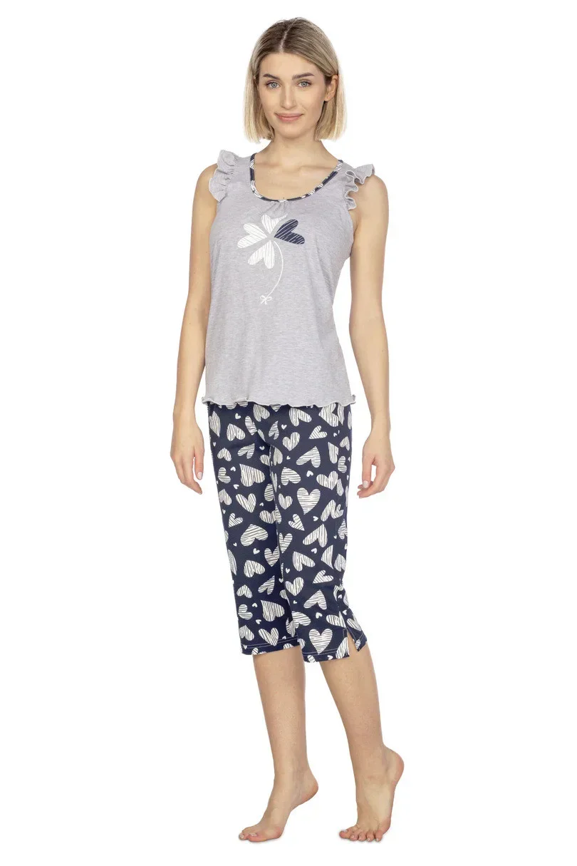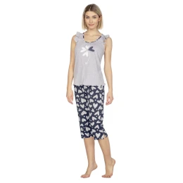 Dámské pyžamo s širokými nohavicemi ušité z kvalitní bavlny. Potisk na úrovni hrudníku. Doplňují je vzorované kalhoty s jemnými průstřihy.