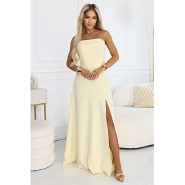 Elegantní maxi šaty značky Numoco v módní máslově žluté barvě jsou jedinečným návrhem na svatbu, ples i elegantní večírek. Korzetový vršek bez ramínek, efektní zavazování na zádech a rozparek na nohavičce krásně zvýrazní siluetu a polská výroba zaručuje vysokou kvalitu zpracování.