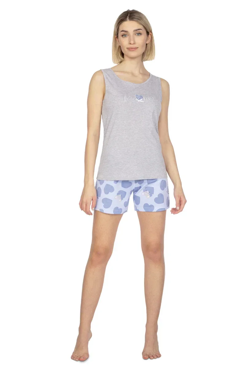 Dámské pyžamo s širokými ramínky ušité z měkké bavlny. Potisk na úrovni hrudníku. Doplněné vzorovanými krátkými šortkami.