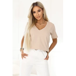665-3 Dámská bavlněná halenka s výstřihem do V a krátkými rukávy - béžová