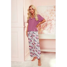 Dámské pyžamo ušité z viskózy. Tričko s krátkým rukávem a výstřihem. Doplňují je volné kalhoty s rovnými nohavicemi.