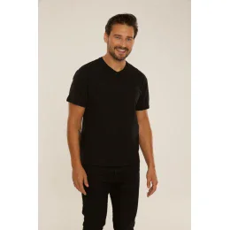 Koszulka ma klasyczny krótki rękaw oraz dekolt w szpic, który podkreśla męski charakter stylizacji. Świetnie sprawdzi się zarówno jako samodzielny element garderoby, jak i pod bluzę czy marynarkę.
