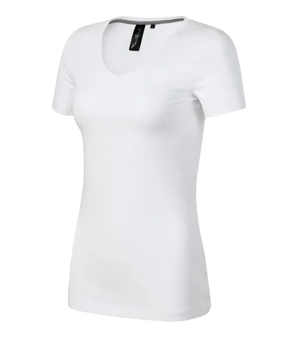 strečový materiál udržující stálost tvaru přiléhavý střih s bočními švy hlubší výstřih ve tvaru V úzký lem průkrčníku z žebrového úpletu 1:1 s 5 % elastanu vnitřní část průkrčníku začištěna kontrastní páskou zpevnění ramenních švů páskou krátké přiléhavé rukávy