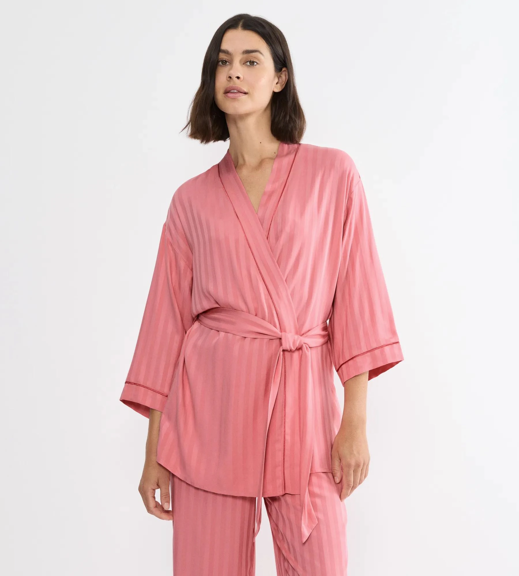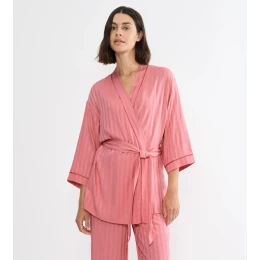 Tento krátký župan kombinuje pohodlí s propracovaností. Navržen s plynulým padnutím, tento zavinovací župan má 7/8 kimono rukávy a matching pásek. Propracované lemování dodává celkovému designu nádech rafinovanosti. Vyroben z měkkého, plynulého materiálu s pruhovaným lesklým a matným žakárovým vzorem.