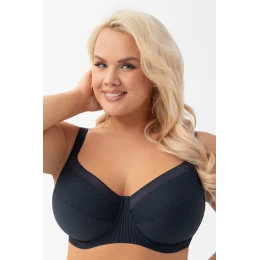 Wyróżnia się modnym, pionowym żakardowym wzorem oraz delikatną, transparentną siateczką w górnej części miseczek, która subtelnie podkreśla dekolt. Biustonosz posiada regulowane ramiączka, co umożliwia indywidualne dopasowanie, oraz klasyczne zapięcie na haftki z tyłu.