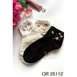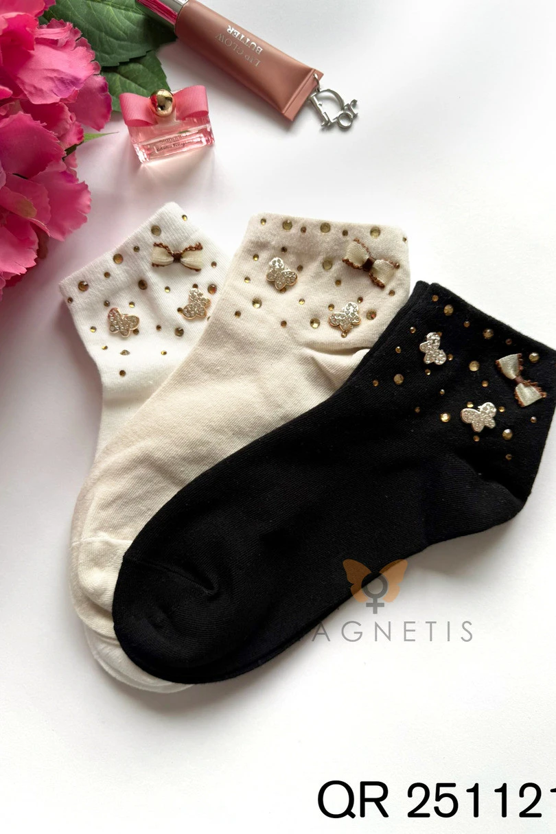 Skarpetki damskie Magnetis QR-251121 z aplikacją to elegancki i efektowny model, który zachwyca bogatymi zdobieniami. Subtelne kokardki, dekoracyjne motylki oraz połyskujące złote dżety tworzą wyjątkową kompozycję, nadając skarpetkom luksusowego i kobiecego charakteru. To modny dodatek, który przyciąga uwagę i podkreśla styl każdej stylizacji. Wysoka zawartość bawełny (92%) zapewnia naturalną przewiewność, miękkość oraz komfort noszenia przez cały dzień. Elastan (8%) odpowiada za elastyczność i idealne dopasowanie do stopy, dzięki czemu skarpetki nie zsuwają się i nie tracą swojego kształtu nawet po wielokrotnym praniu. Materiał jest przyjazny dla skóry i odporny na deformacje. Model QR-251121 doskonale sprawdzi się w zestawieniu z balerinami, mokasynami, czółenkami czy eleganckimi półbutami. Idealny wybór do stylizacji casualowych, wizytowych oraz romantycznych. To propozycja dla kobiet, które cenią modne detale, wysoką jakość i efektowny design.