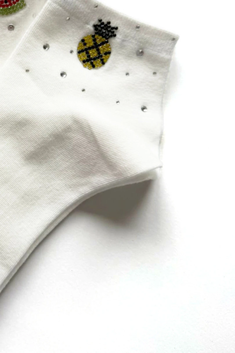 Skarpetki damskie Magnetis QR251116 02 z aplikacją to modny i kobiecy dodatek, który doskonale uzupełni codzienne stylizacje. Klasyczny biały kolor został ozdobiony efektowną aplikacją w kształcie ananasa oraz subtelnymi, dekoracyjnymi kryształkami, które nadają całości wyjątkowego charakteru. To idealne skarpetki wzorzyste dla kobiet, które cenią modne detale i stylowe akcenty. Wysoka zawartość bawełny (92%) zapewnia miękkość, przewiewność i komfort noszenia przez cały dzień. Dodatek elastanu (8%) gwarantuje elastyczność oraz idealne dopasowanie do stopy, dzięki czemu skarpetki nie zsuwają się i zachowują swój kształt nawet po wielokrotnym praniu. Materiał jest przyjemny dla skóry oraz odporny na deformacje. Model QR251116 02 świetnie sprawdzi się w stylizacjach casualowych, sportowych oraz w modnych zestawach z nutą elegancji. Doskonale komponuje się ze sneakersami, trampkami, balerinami czy loafersami. Skarpetki z aplikacją Magnetis łączą wygodę, jakość i modn