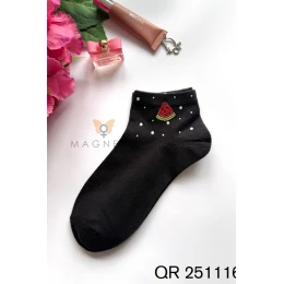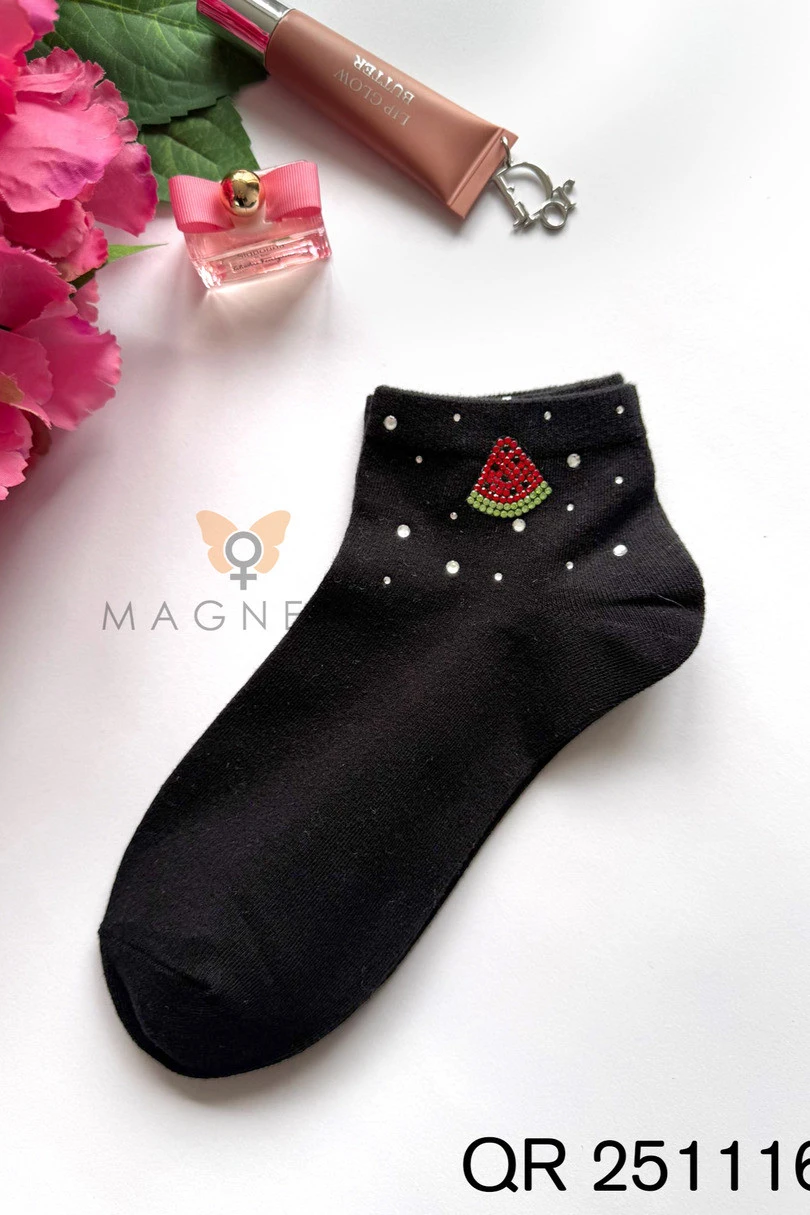 Skarpetki damskie Magnetis QR251116 04 z aplikacją to modny i oryginalny dodatek, który nada charakteru każdej stylizacji. Klasyczna czerń została ozdobiona efektowną aplikacją w kształcie arbuza oraz subtelnymi dekoracyjnymi elementami, które przyciągają wzrok i podkreślają kobiecy styl. To idealny wybór dla kobiet, które cenią modne, wzorzyste skarpetki z wyrazistym detalem. Wysoka zawartość bawełny (92%) zapewnia naturalną przewiewność, miękkość i komfort noszenia przez cały dzień. Dodatek elastanu (8%) gwarantuje elastyczność oraz idealne dopasowanie do stopy, dzięki czemu skarpetki nie zsuwają się i zachowują swój kształt nawet po wielokrotnym praniu. Materiał jest przyjemny dla skóry oraz odporny na deformacje. Model QR251116 04 doskonale sprawdzi się w stylizacjach casualowych, miejskich i sportowej elegancji. Świetnie komponuje się ze sneakersami, trampkami, loafersami czy botkami. Skarpetki z aplikacją Magnetis to połączenie wygody, jakości i modnego design